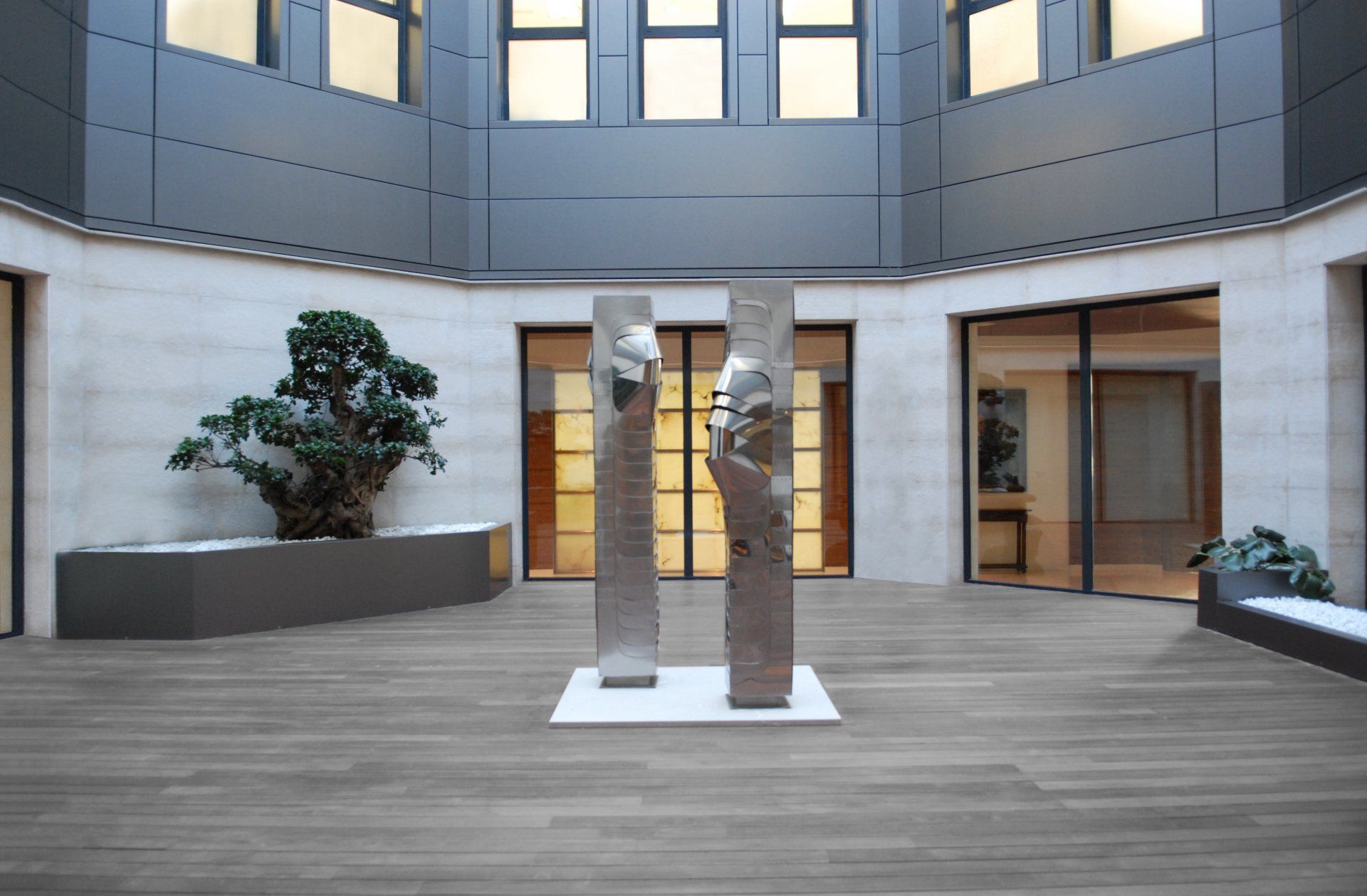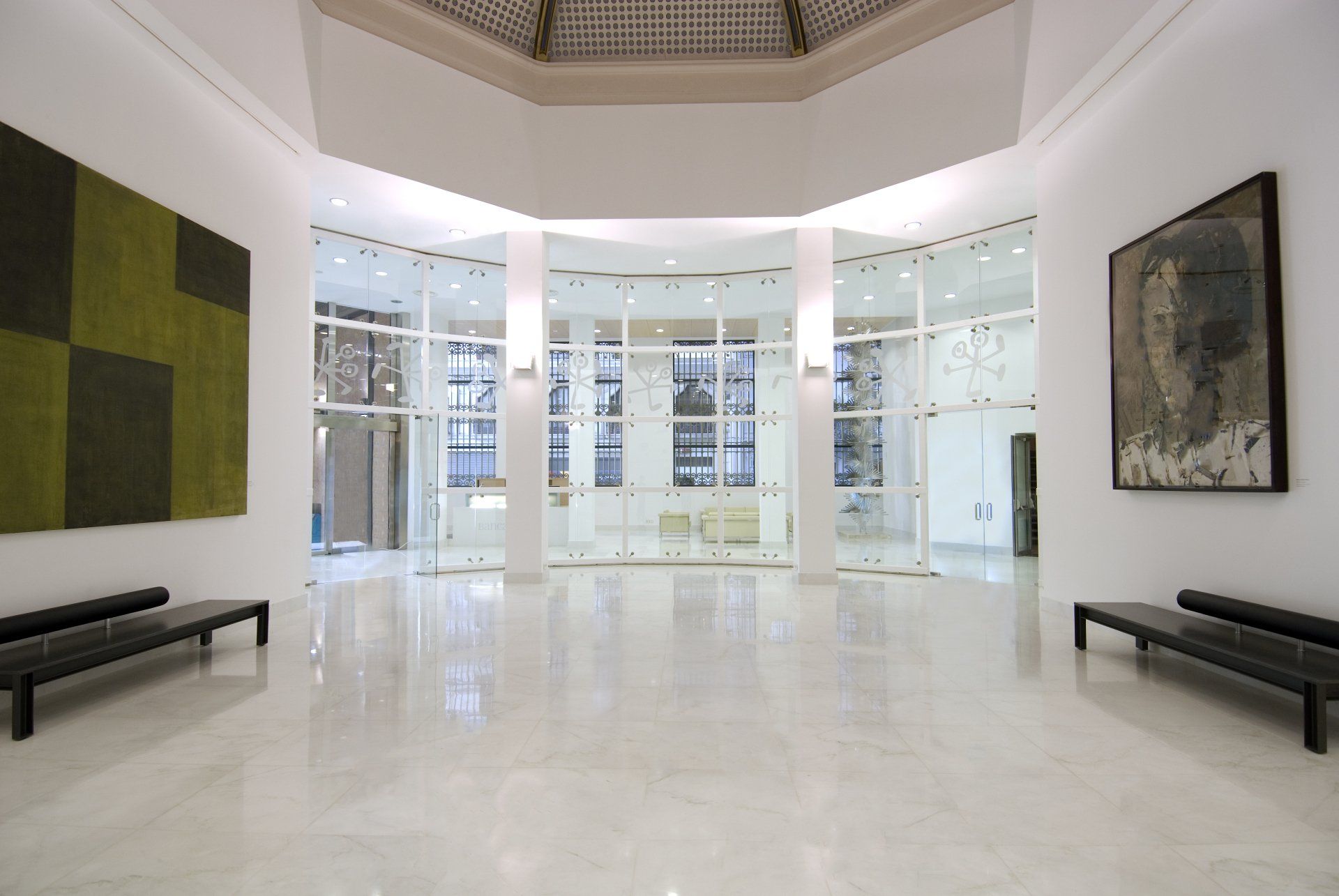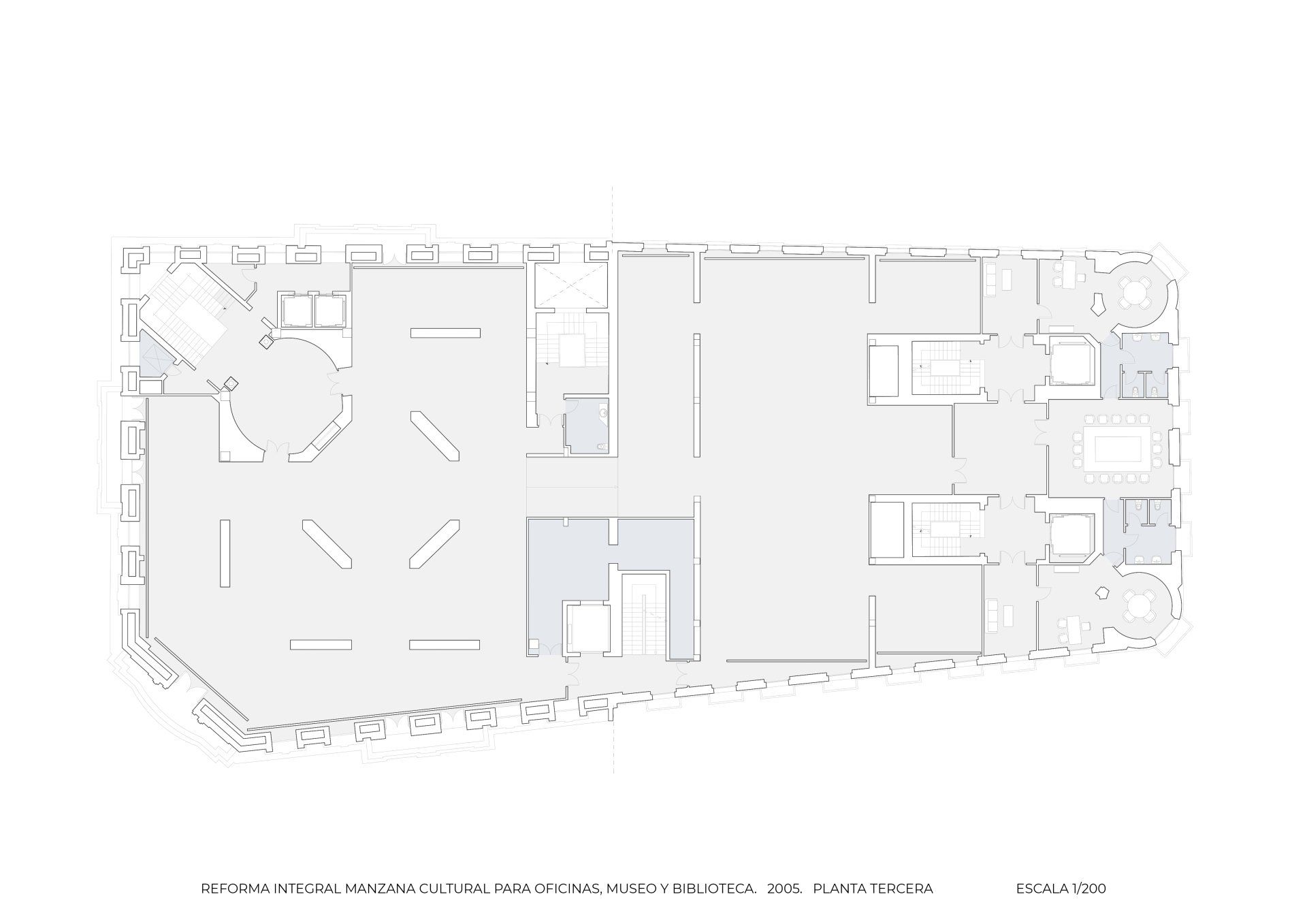 3. Unir las plantas segunda y tercera de Glorieta con la tercera y cuarta de la Fundación, para conseguir una gran sala de exposiciones, dado que las dos plantas tienen casi la misma cota de altura. (Unimos los edificios puntualmente y conservamos su independencia espacial y funcional). En la planta segunda de Glorieta se propuso cubrir el patio para proteger la cúpula de planta baja y primera.